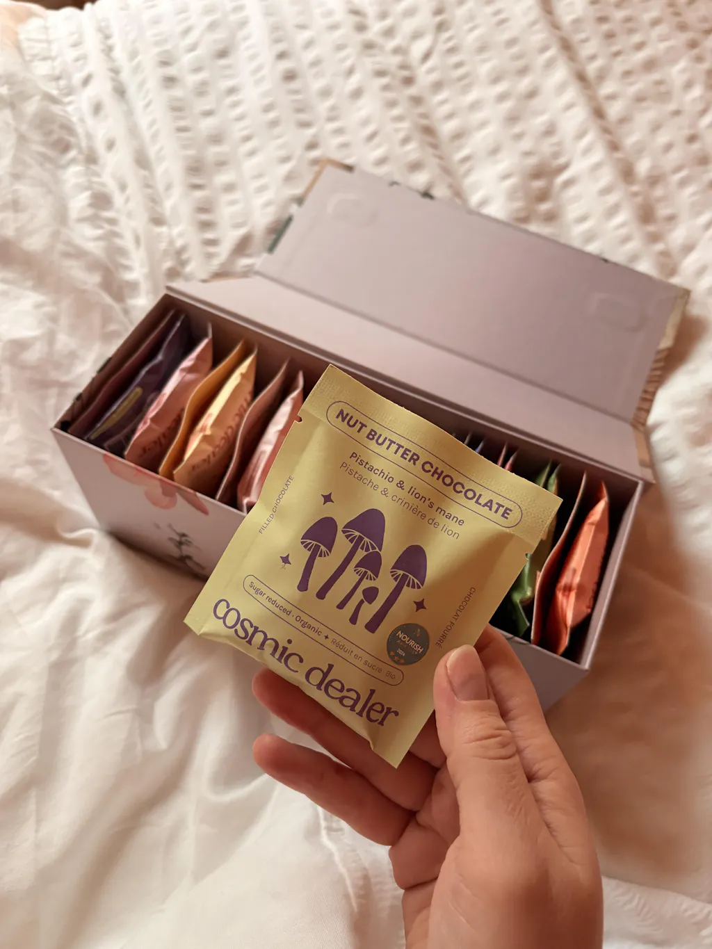 Pistachio & Lion's Mane: Dark chocolate (cocoa solids: 75%) (cacao beans,* date powder*), Pistachio puree (23%),* Almond puree,* Cocoa butter,* Pistachios (8%),* Lion’s Mane powder (Hericium erinaceus extract) (0,3%),* Salt